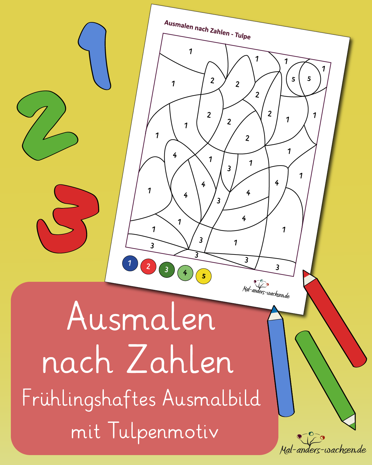- Ausmalen nach Zahlen. Frühlingshaftes Ausmalbild mit Tulpenmotiv