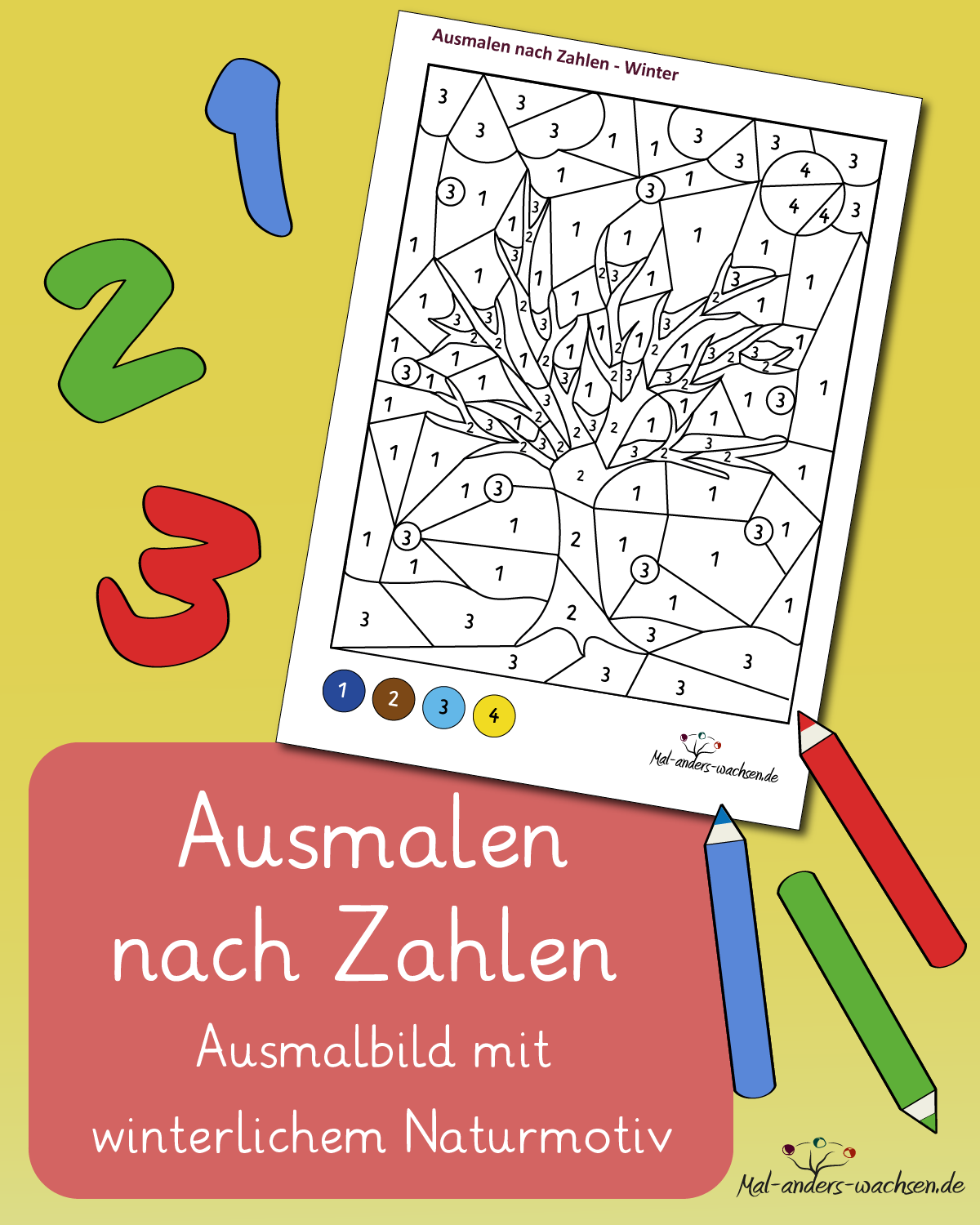 Das Arbeitsblatt eignet sich besonders gut für Kinder, die gerade beginnen, Zahlen sicher zu erkennen. Die Zahlen von 1 bis 4 sind klar zugeordnet und ermöglichen einen sanften Einstieg in das Prinzip „Zahl erkennen, Farbe zuordnen, Fläche gestalten“. Dabei trainieren die Kinder nicht nur ihr Zahlenverständnis, sondern auch ihre Aufmerksamkeit und Feinmotorik. Ganz nebenbei entsteht ein stimmiges Winterbild, auf das sie stolz sein können.
