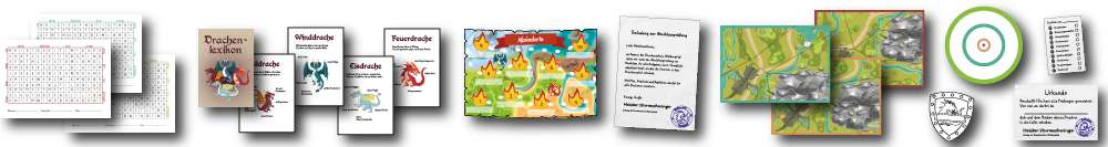Wir haben schon alles ausgearbeitet und es fehlen nur noch wenige Handgriffe sowie ein paar Dinge, die ihr wahrscheinlich schon zu Hause habt. Folgende Dinge werden zusätzlich benötigt: Drucker und Papier, Scheren, Klebestifte, Buntstifte, Stühle, Decken/ Laken, weiche Gegenstände (z. B. Matten oder Kissen), Tonkarton, Gummiband, Dracheneier (je nach Anzahl der Kinder z. B. Überraschungseier, angemalte oder in Alufolie gewickelte Papp- oder Kunststoffeier).