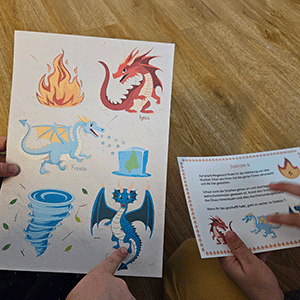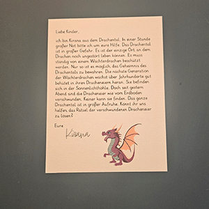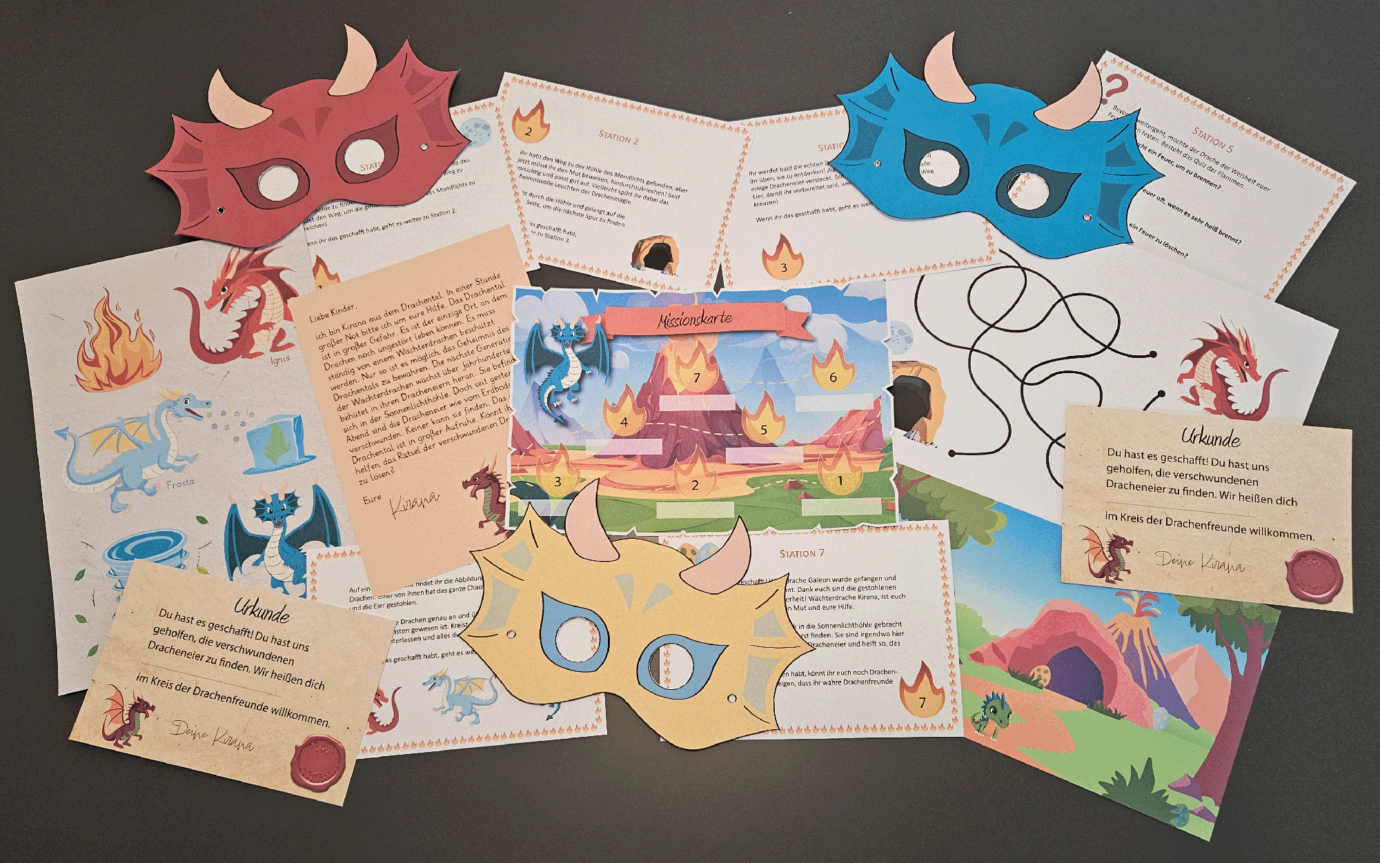 Diese Drachenschnitzeljagd ist speziell für Kinder im Grundschulalter konzipiert und die Aufgaben sind in eine liebevolle Geschichte eingebettet.