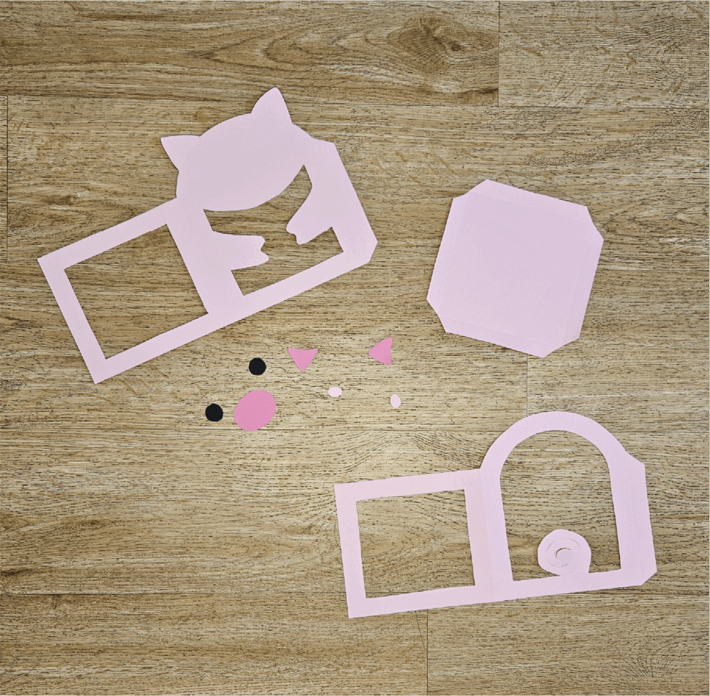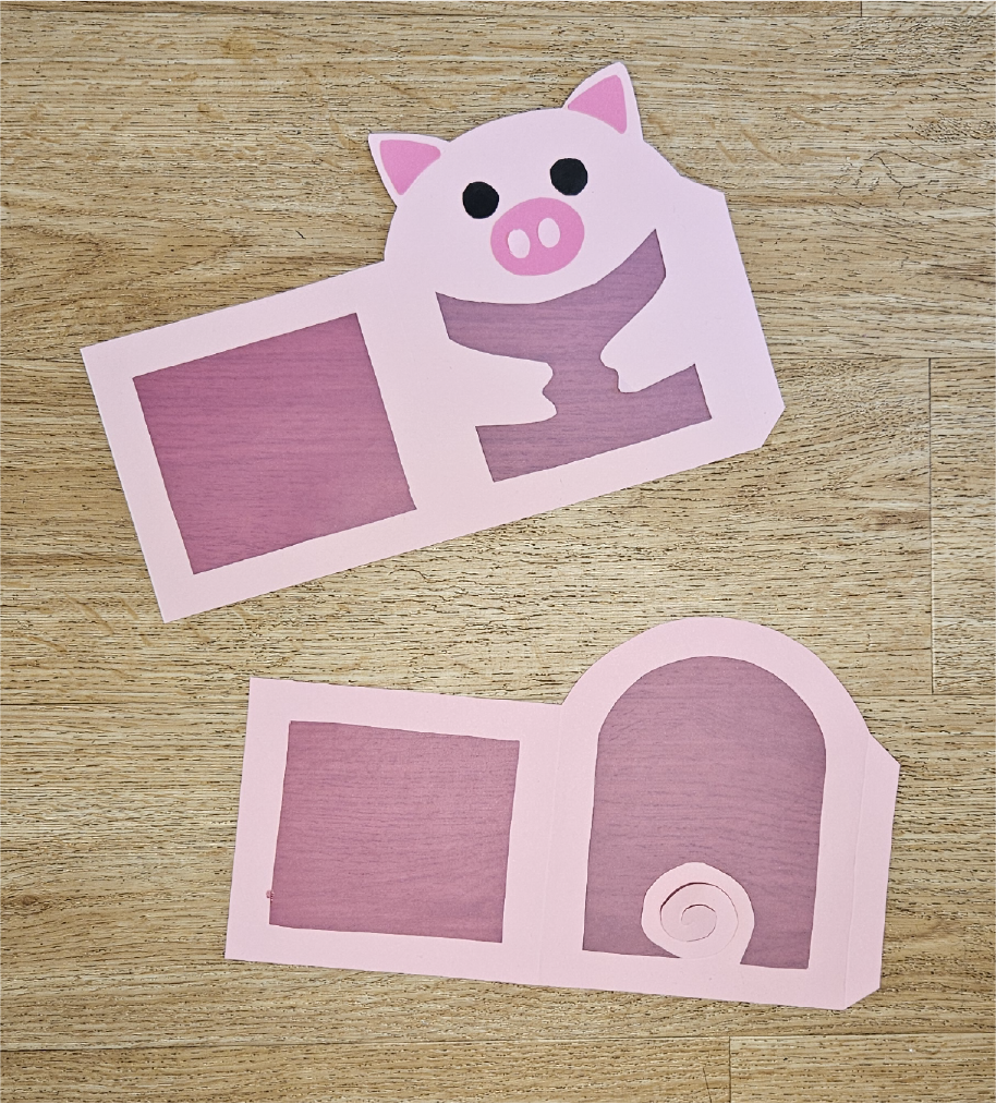 Die Vorlage wird zuerst auf stabilen, rosafarbenen Tonkarton übertragen und sorgfältig ausgeschnitten. Besonders spannend ist der Kringelschwanz. Hier sollten Erwachsene unterstützen, da das Schneiden der Rundungen etwas Übung benötigt.