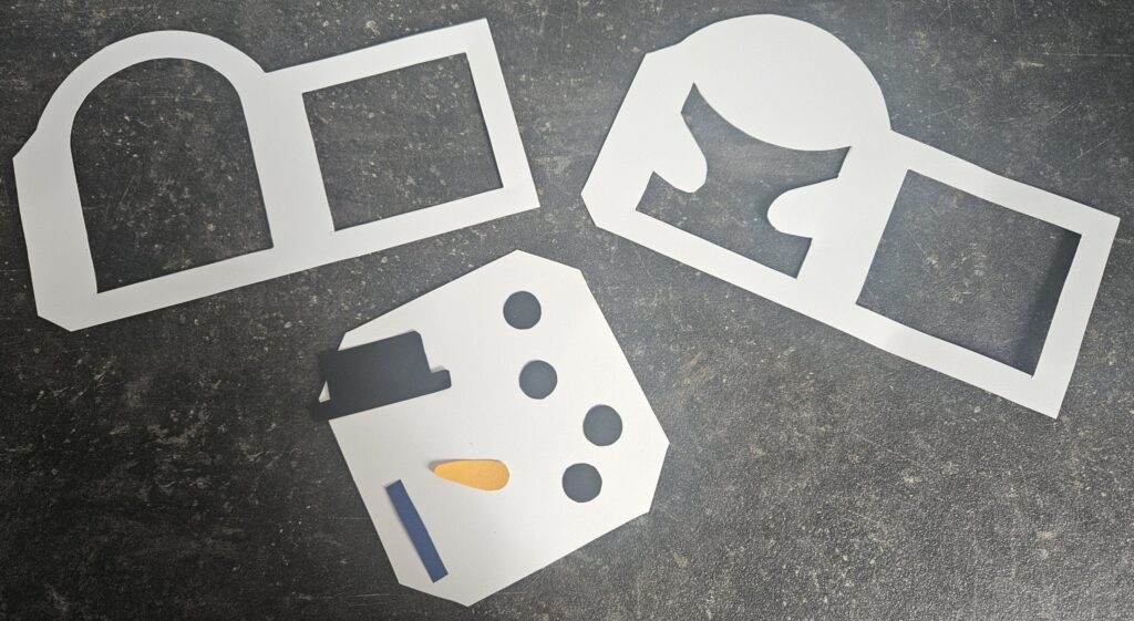 Danach schneidest du die einzelnen Elemente sorgfältig aus. Für die Augen und Knöpfe nutzt du schwarzen Tonkarton. Der Hut bekommt ebenfalls Schwarz. Die Nase darf gelb oder orange leuchten. Für das Hutband kannst du eine beliebige Farbe wählen. Wir haben uns für Blau entschieden.